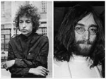 A black and white picture of Bob Dylan holding a cigarette by a window. John Lennon wears a white turtleneck and glasses.