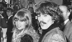 A black and white picture of George Harrison sitting with his arm around Pattie Boyd.